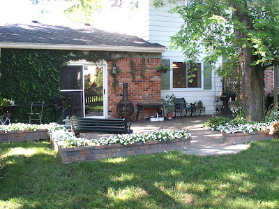 The first year the playhouse was built. 2nd year the patio pavers went in (including building up the foundation of it by almost 2 feet), 3rd year the elevated surrounding flower wall and the 4th year, the lattice work panels at both ends of the patio were constructed. In between there the patio furniture was built, altered (an old bench was converted into a chair, and old wood on some pieces was replaced)and painted. The large tree was always there, in fact the patio was designed around it. In the 5th year, not shown, but down a few steps and around the corner is an 18" retaining wall flower bed along the path to the gate.